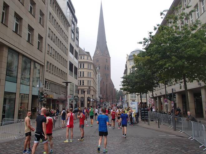 Jakobikirchhof 9.30 Uhr Den Rest mußte ich also mit dem Kopf schaffen. Also Musik zur Einstimmung, Pasta am Abend davor, noch eine Runde Zirkel-Training in der Turnhalle vom Hamburger Laufladen und immer nur schön an das eine Ziel denken. |
