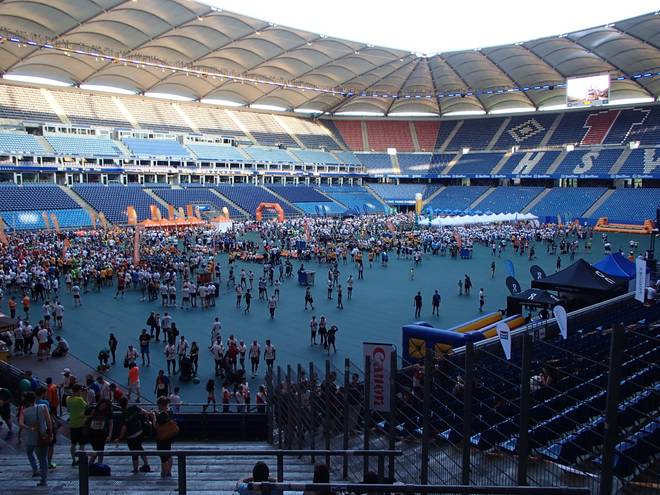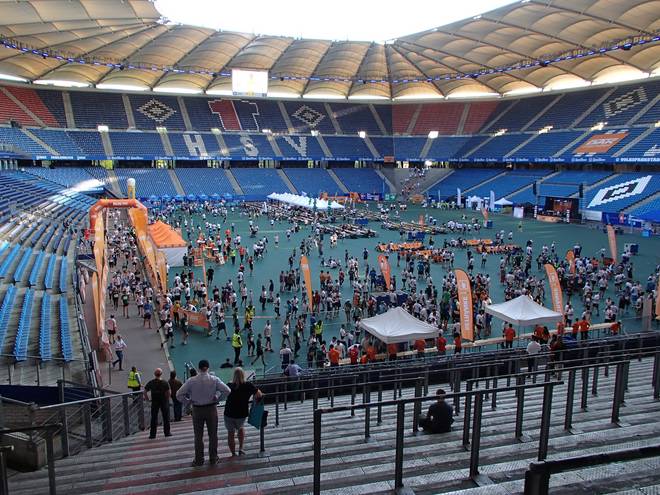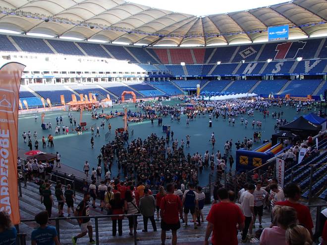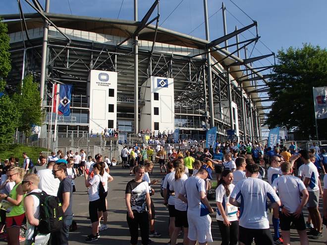 Volksparkstadion Hamburg 18.33 Uhr Das Wetter war noch gut. Mit um die 24°C war es zwar recht warm, aber nichts gegen die 31°C vom Vorjahr und außerdem läuft man ja meist im schattigen Park. |