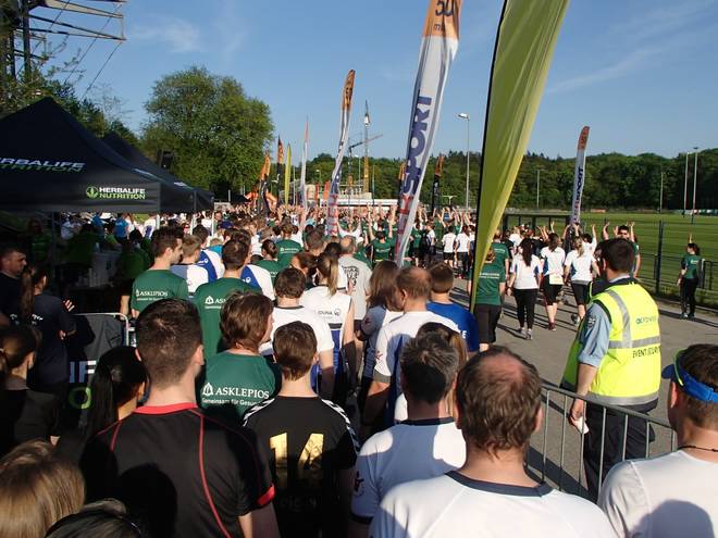 Sportanlage Volkspark 18.52 Uhr Dann ging es zum Start. Die Startaufstellung war dieses Jahr neu geregelt. Statt einem gab es vier Starts (19.00, 19.15, 19.30 und 19.45 Uhr). Das sollte das Feld etwas besser verteilen. |