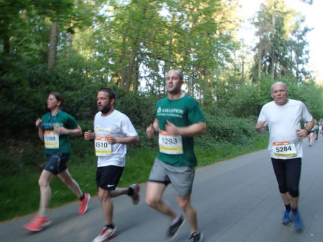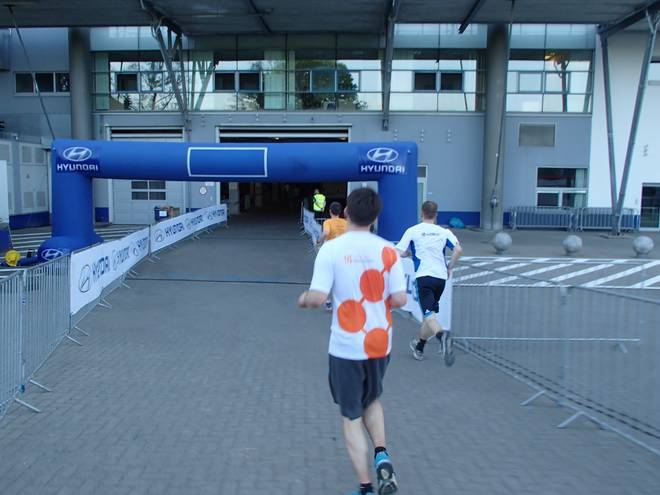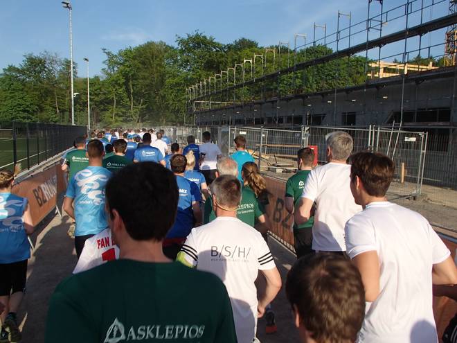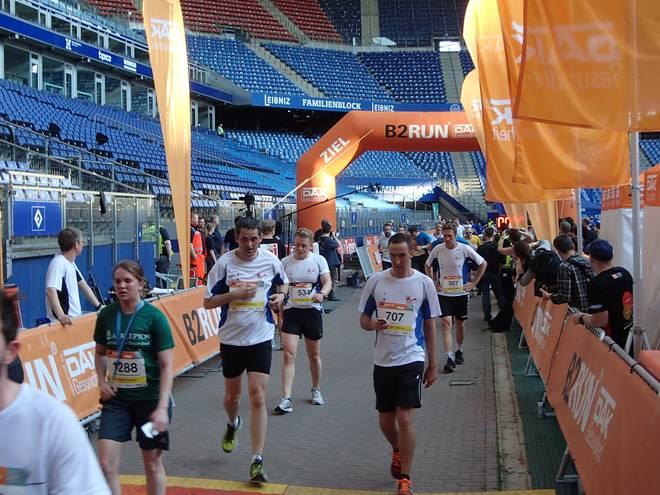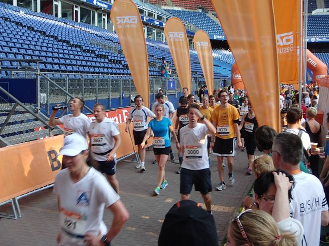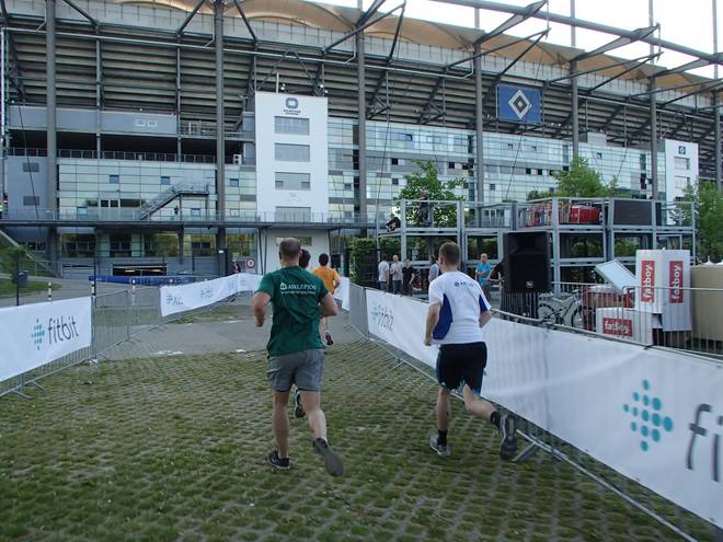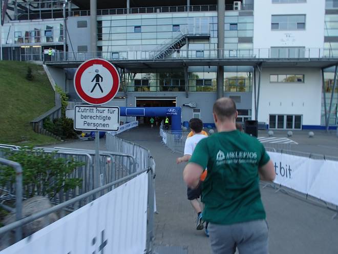 Volksparkstadion Hamburg 19.34 Uhr Ein paar Läufer erwischte ich mit der Kamera, aber nicht alle. Wir brauchen auffälligere Shirts als weiß. Aber bitte nicht Asklepios-Grün. |