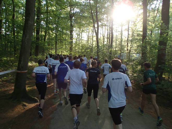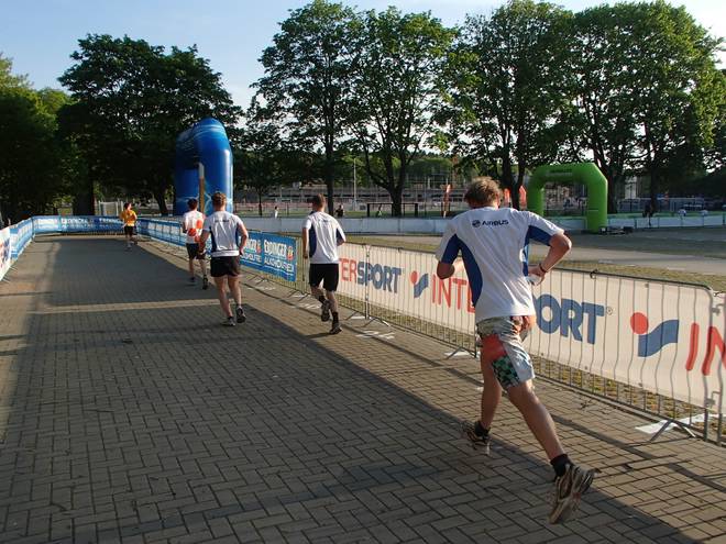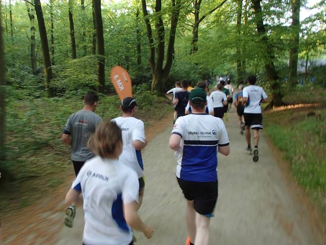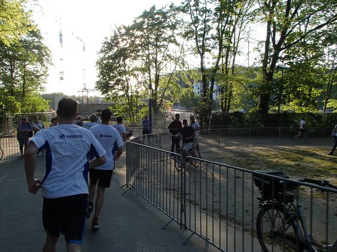 Altonaer Volkspark 19.05 Uhr Knapp zwei Kilometer dauerte es, ehe ich einigermaßen frei laufen konnte. Bis dahin rannte ich immer nur hinter Leuten her. Vor allem die Airbus-Leute, die sich scheinbar in Masse in den Unter-30-Minuten-Bereich eingereiht hatten und nun wie die Slalom-Stangen im Feld standen. |