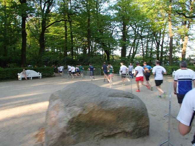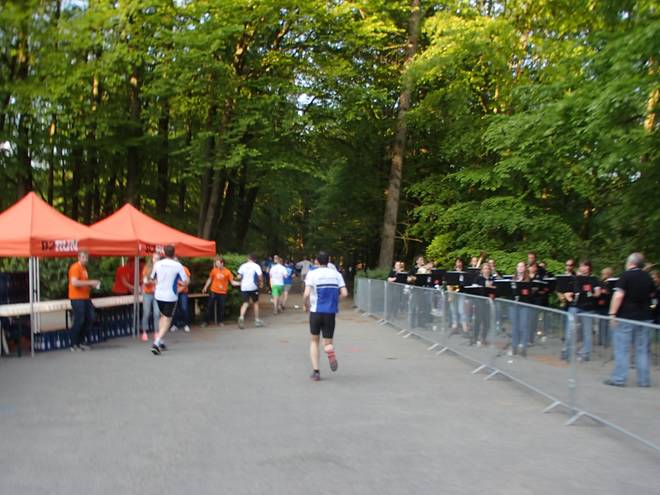 Altonaer Volkspark 19.20 Uhr Nicht weit hinter Kilometer 4 gab es Musik und Getränke. Da die langsamsten Teilnehmer über 1:20 Stunden benötigten, war so ein Verpflegungsstand keine schlechte Idee. |