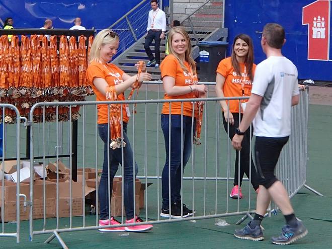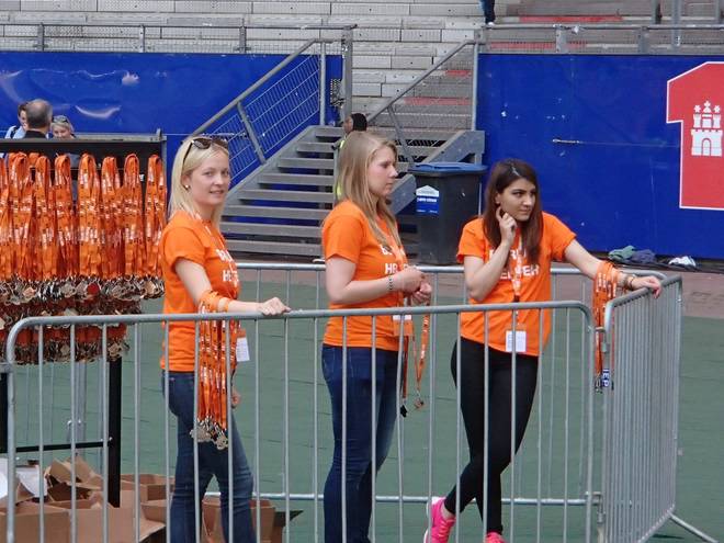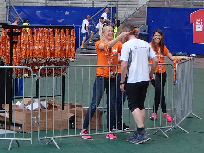 Volksparkstadion Hamburg Nächster Programmpunkt war dann die Medaille. Nicht erst seit dem Cuxhaven-Marathon einen Monat zuvor lege ich viel Wert darauf, das Schmuckstück so schnell es geht in die Finger zu bekommen. |