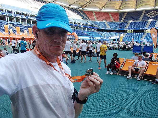 Volksparkstadion Hamburg 19.30 Uhr Schon meine vierte Medaille vom B2RUN. Schnell verdient. Beim Marathon muß ich neun- bis zehnmal so lange laufen. |
