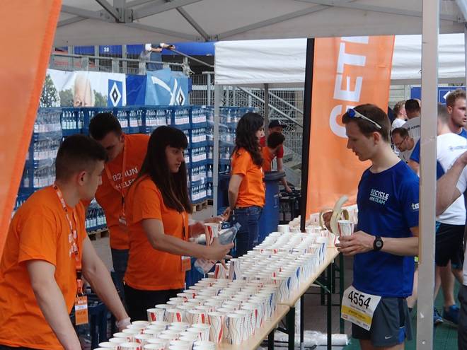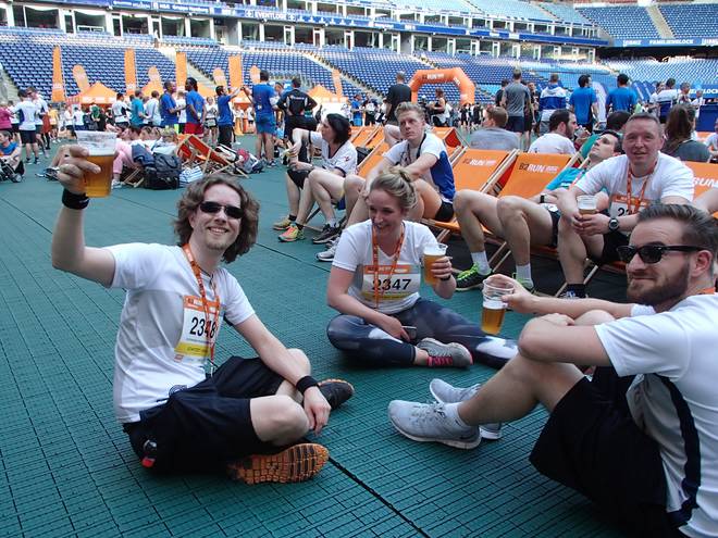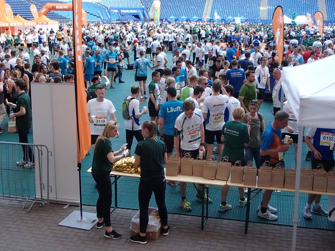 Verpflegung | 7 Punkte | Vor dem Start suchte man vergeblich nach etwas zu trinken (außer am Waschbecken der Arena-Toiletten). Auf der Strecke eine Wasserstele und im Ziel dann Wasser, Bier und reichlich Obst. |