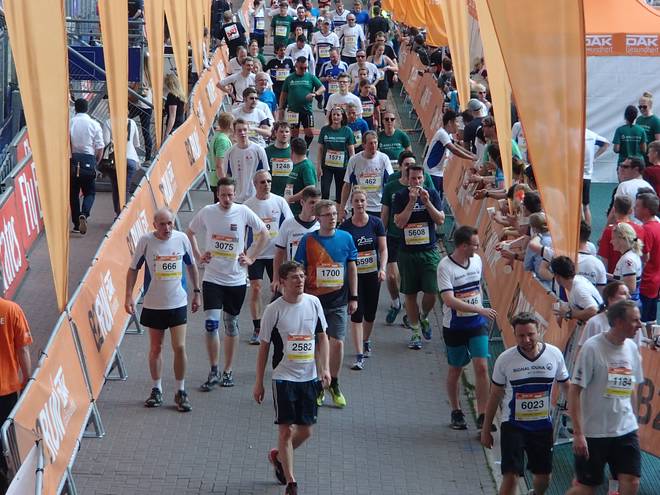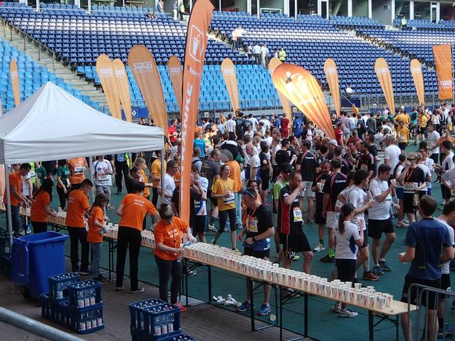 Organisation | 5 Punkte | Die Anmeldung und die Kosten übernahm meine Firma, Startunterlagenabholung in einem Autohaus und der Lauf mit Finish im Volksparkstadion. Klappt soweit alles ganz gut. Die Strecke ist allerdings keine sechs Kilometer lang und die Kilometer-Schilder stehen eher zufällig irgendwo herum. |