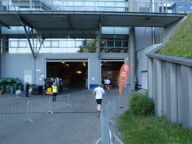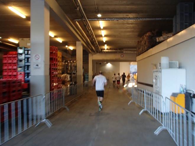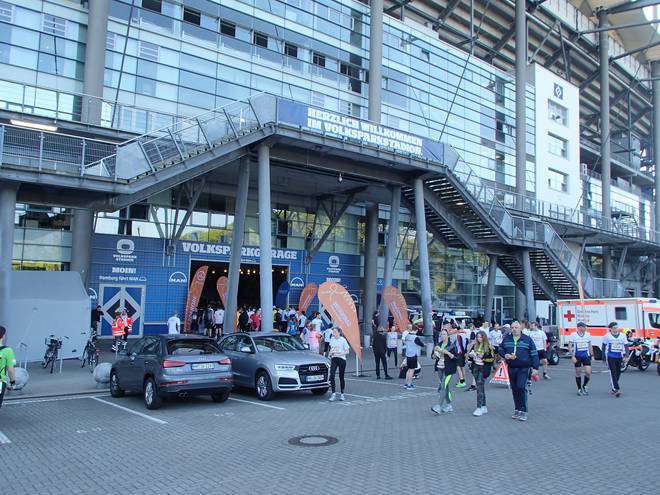 Volksparkstadion 19.24 Uhr / Km 5,5 Das lange Gekurve über den Parkplatz war ziemlich nervig. Die Strecke war hier viel länger als gehofft. |