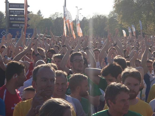 Altonaer Volkspark 19.05 Uhr / Km 1,1 Dazu die Läufer, die sich in der Startaufstellung viel zu weit nach vorne stellen und dann von der Masse überholt werden müssen. |