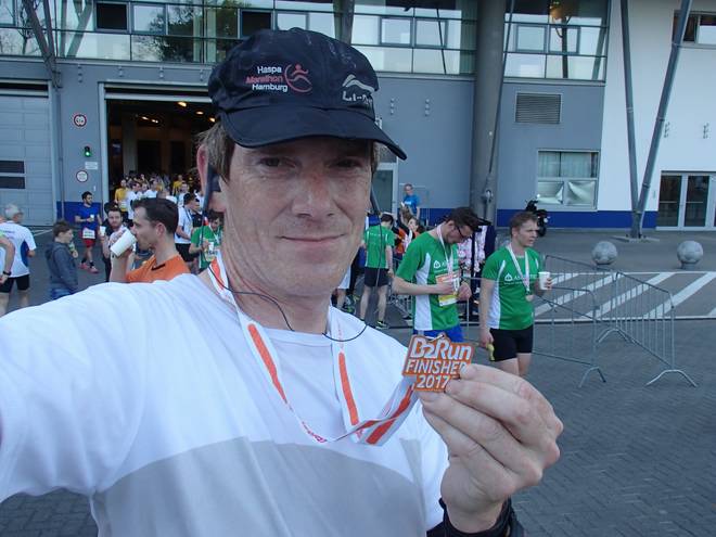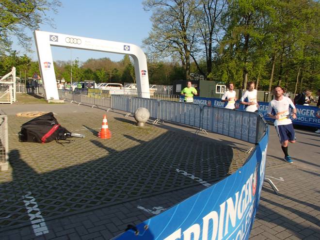 Volksparkstadion 19.25 Uhr / Km 5,85 Auch wenn es bei Kilometer 4 nicht danach aussah, unterbot ich meine Zeit aus dem Vorjahr (die auf einer 100 Meter längeren Strecke gelaufen war). Neben dem, was ich mit meiner Uhr selbst stoppte, gab es noch eine offizielle Zeitmessung. Die war allerdings etwas seltsam. |