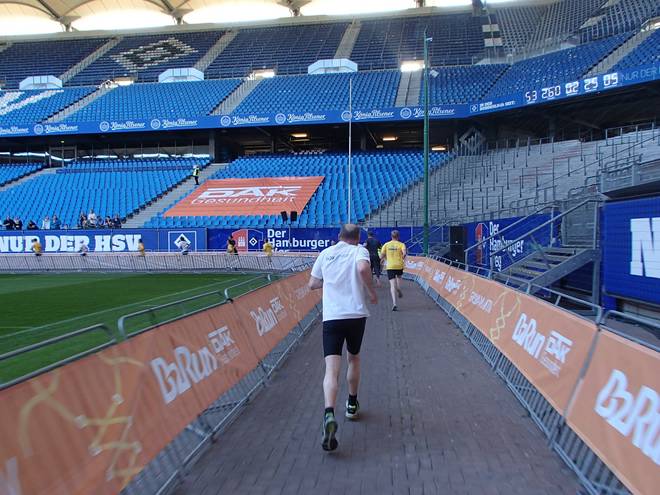 Volksparkstadion 19.24 Uhr / Km 5,6 Und warum muß man in dieses Stadion einlaufen? Bei allen anderen B2RUN-Läufen in Deutschland läuft man am Ende in ein wirklich wichtiges Stadion ein. Nur nicht in Hamburg. |