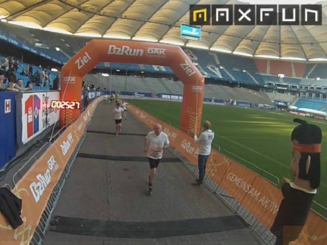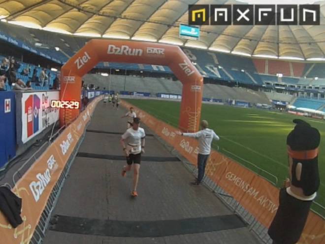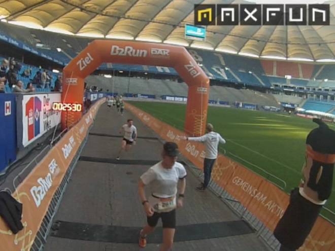 Volksparkstadion 19.25 Uhr / Km 5,9 Hier bin ich genau unter dem Zielbogen. Die offizielle Uhr an der Seite zeigt 25:27 Minuten an. Video: Maxfun Sports |
