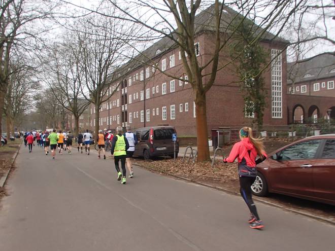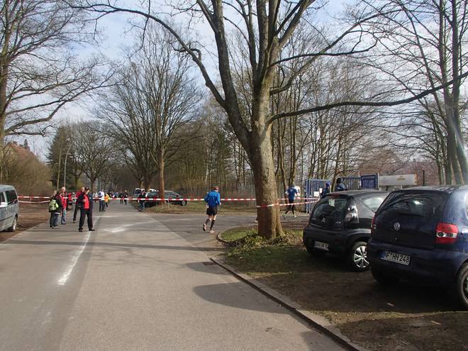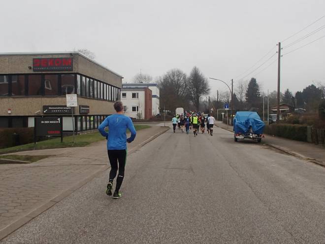 Borsteler Chaussee 9.33 Uhr / Km 0,4 Etwas irritiert verließ ich den Sportplatz. Nach dem Strecken-Plan aus dem Internet sollten wir zu Beginn anderthalb Runden auf der Bahn drehen und erst dann auf die Straße laufen. Aber da keiner meckerte und es ja schon die 26. Austragung war, würde es wohl alles so richtig sein. |