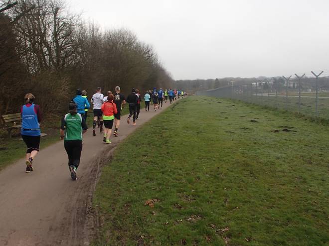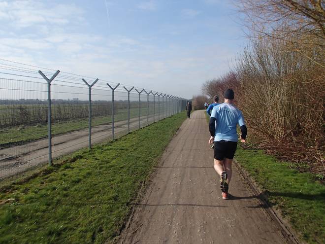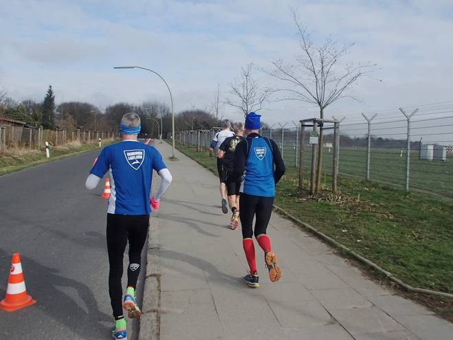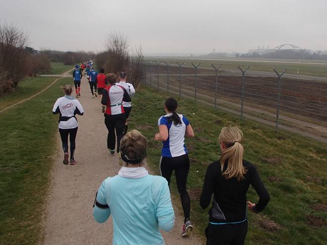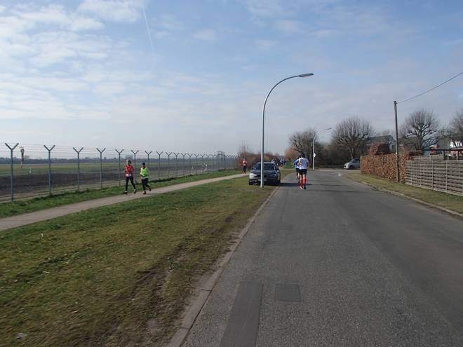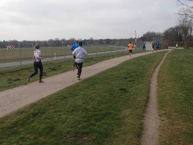 Flughafenwanderweg 9.52 Uhr / Km 4,2 Ich orientierte mich weniger an den Läufern direkt vor mir, sondern vielmehr an Jens und Jörg vom Laufladen, die (so sah es jedenfalls von hinten aus) die Gruppe circa 100 Meter vor mir anführten. Ich wollte ja nicht zurück fallen, wenn jemand aus der Gruppe das Tempo nicht mehr halten konnte. |