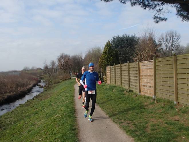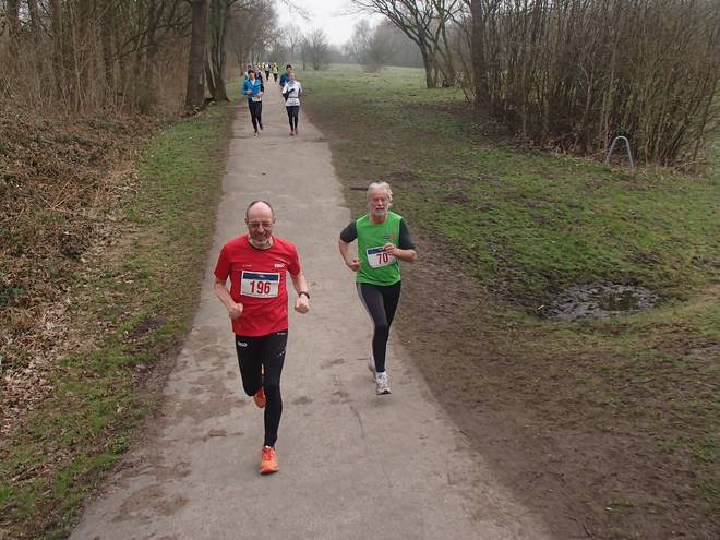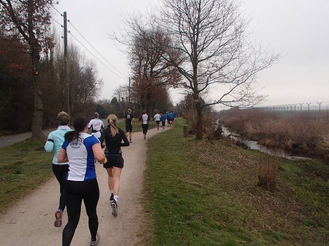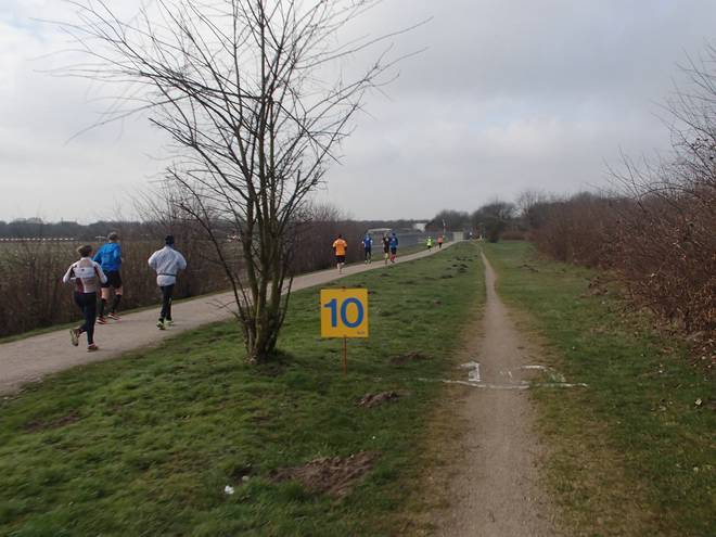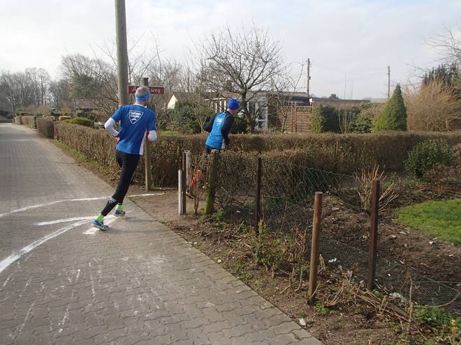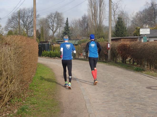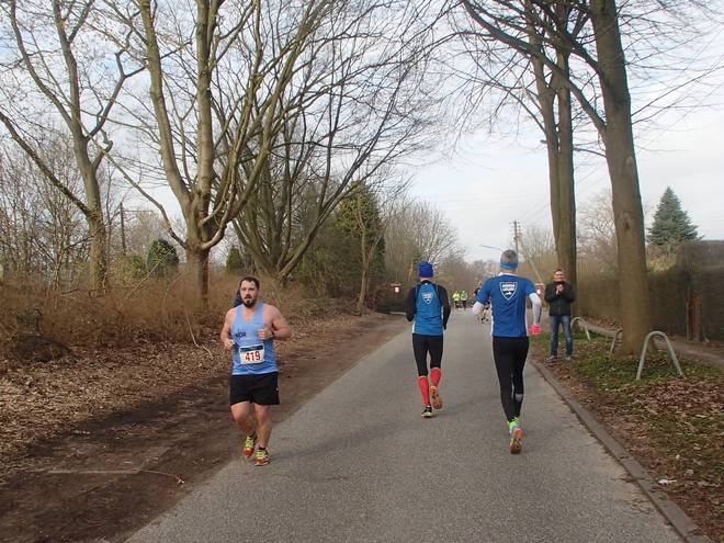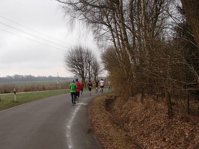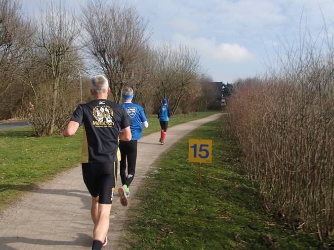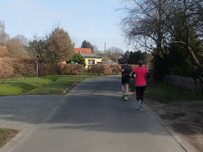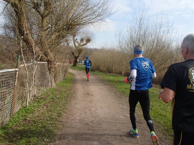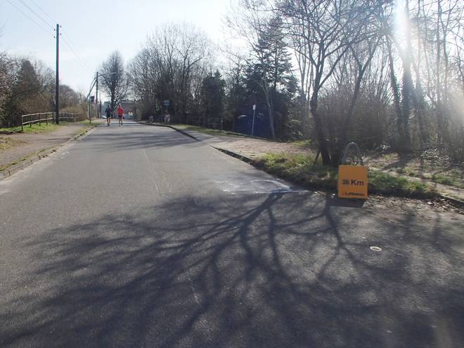 Vogt-Cordes-Damm 10.39 Uhr / Km 13,8 Eigentlich hätte die zwei Blauen jetzt auch gerne überholt, aber gefühlt zogen die nun das Tempo an. Oder ich wurde müder... |