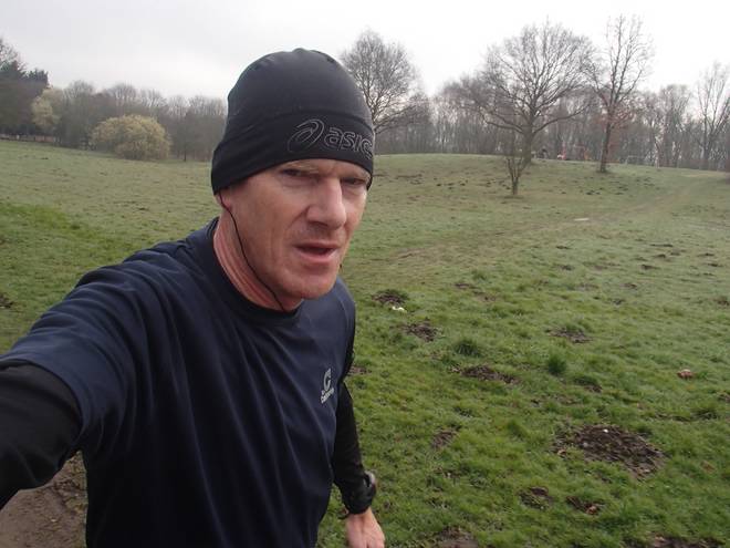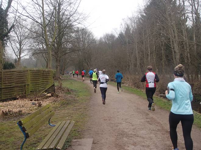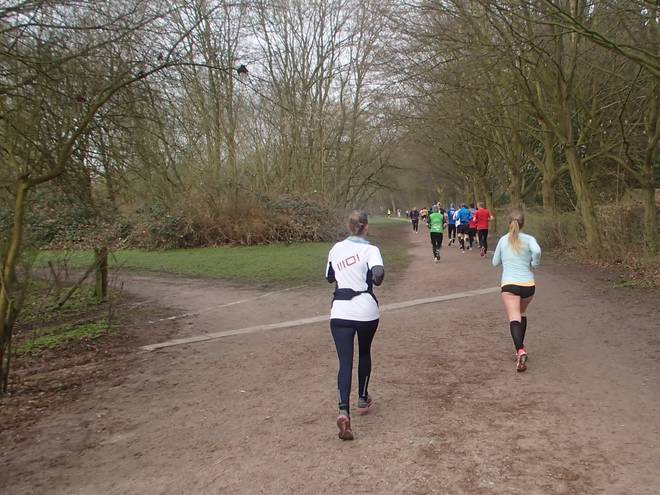 Hasenheide 10.02 Uhr / Km 6,2 Und wieder war ein kleines Loch entstanden, daß ich erst einmal wieder zulaufen mußte. |