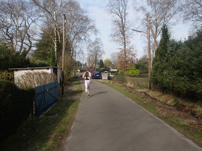Vogt-Cordes-Damm Kleingartenverein 309/310 11.03 Uhr / Km 19,1 Ein paar Kilometerschilder mehr wären nun schön gewesen. Nur um das Tempo kontrollieren zu können. Ich hatte den Überblick verloren, wie ich eigentlich in der Zeit lag und wie weit es noch bis zum Ziel war. |