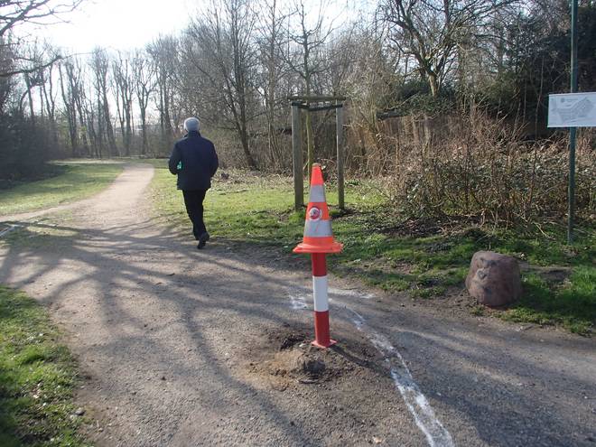 Flughafenwanderweg 10.18 Uhr / Km 9,6 23:49 Minuten für die voran gegangenen fünf Kilometer. Nur weil durch den Fehler am Anfang die Kilometerzahl nicht stimmte, hieß das nicht, daß dies nicht mehr der offizielle Weg war. |