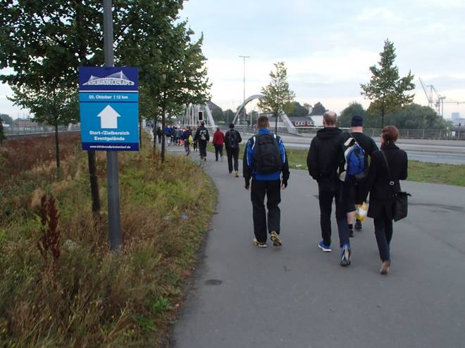 Am Windhukkai 8.46 Uhr Darum ging es. Die zweite Medaille des Wochenendes abgreifen. Mußte ja nur zwölf Kilometer schaffen. In Bremen waren es 42,195 Kilometer. Und ich hatte 1:45 Stunden Zeit. Also alles easy. |