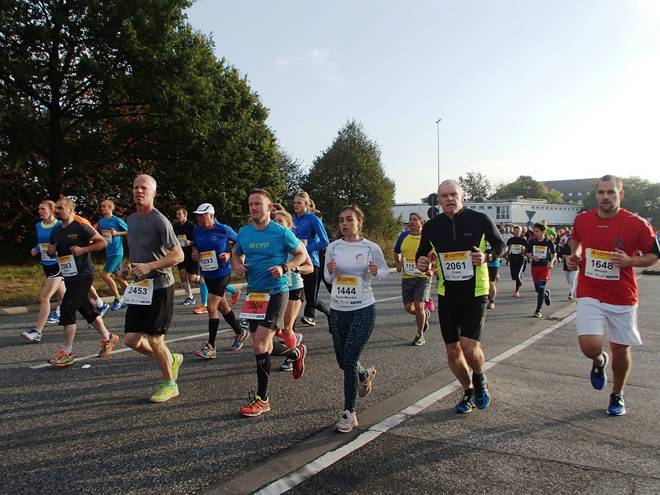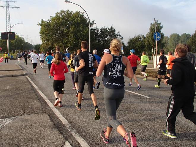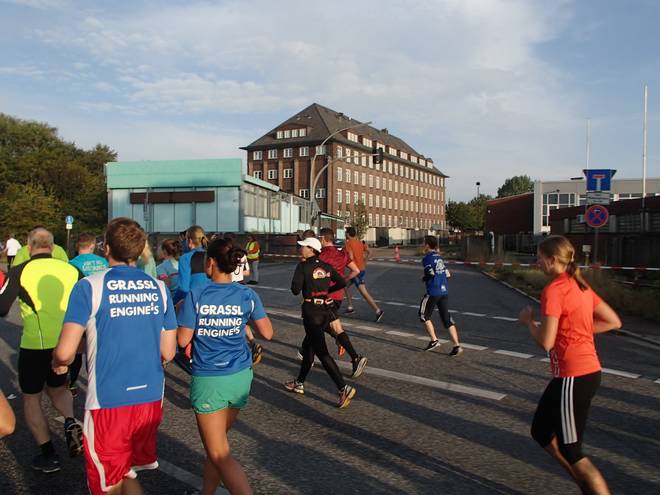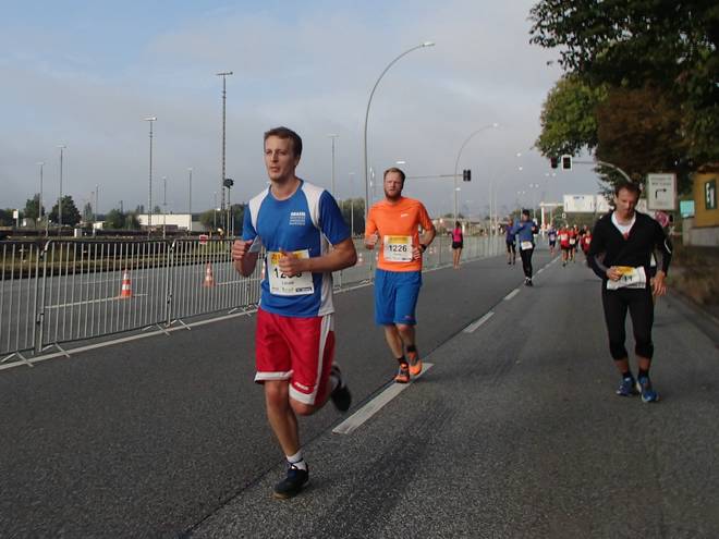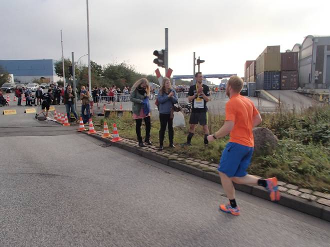 Veddeler Damm 9.05 Uhr / Km 0,6 Den Marathon in Bremen war ich mit einem Schnitt von 4:58 Min/Km gelaufen und ähnlich schnell rannte ich auch hier los. |