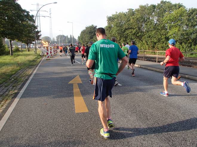 Roßdamm 9.11 Uhr / Km 1,8 Und noch ein Werder-Fan, der sich nach Hamburg traute. Er hatte am Vortag in Bremen die zehn Kilometer unter die Füße genommen. |