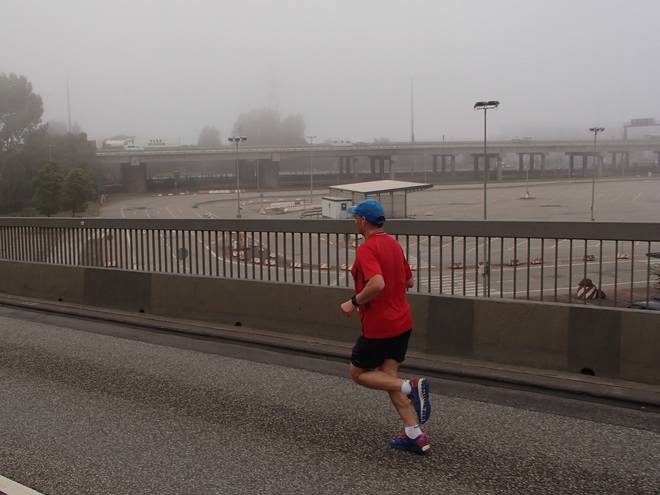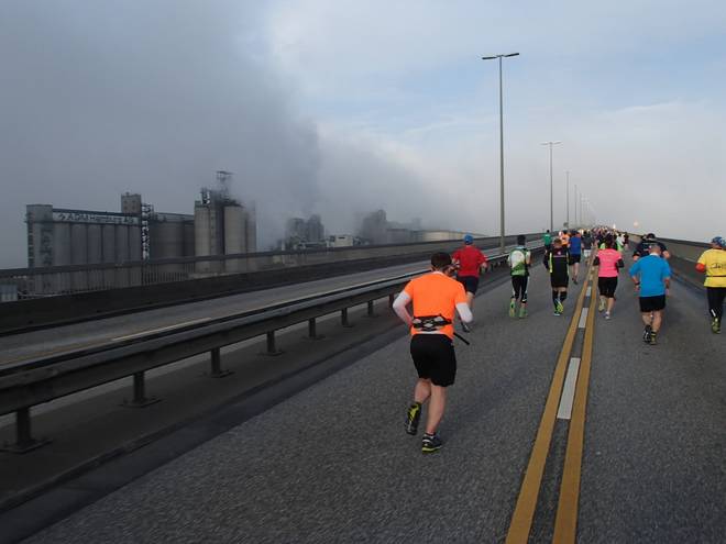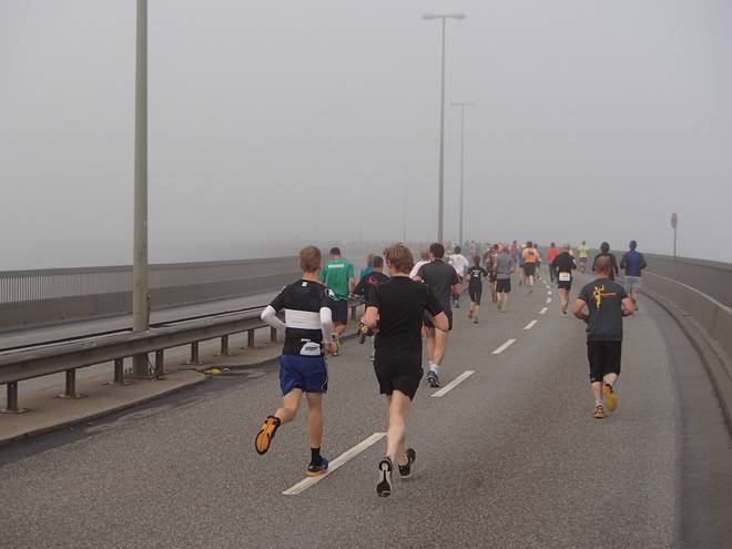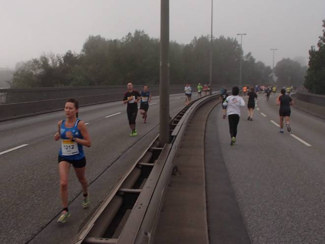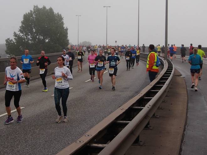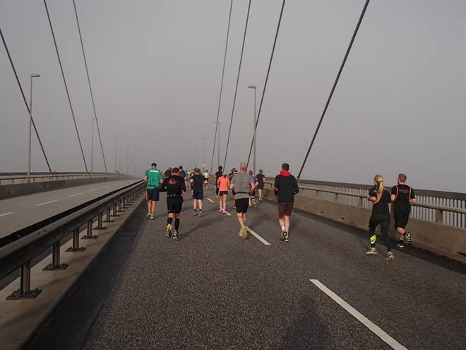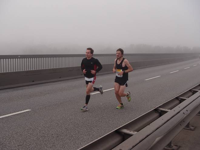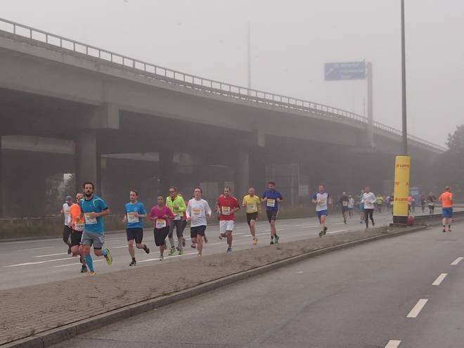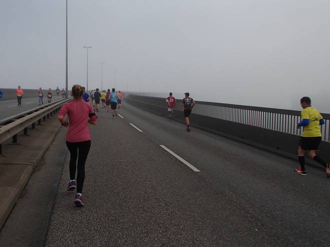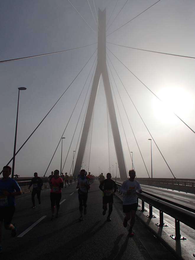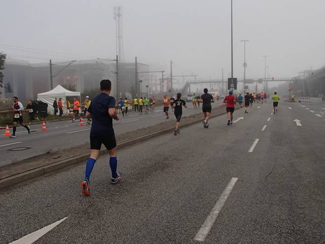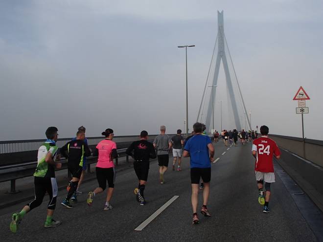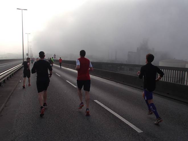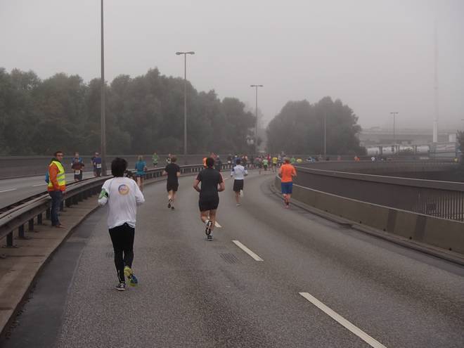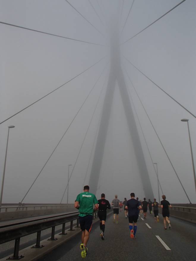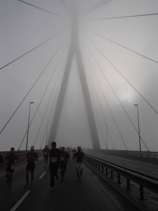 Köhlbrandbrücke 9.25 Uhr / Km 4,6 Während es in der Sonne noch recht angenehm war, war es im Nebel einfach nur kalt. |