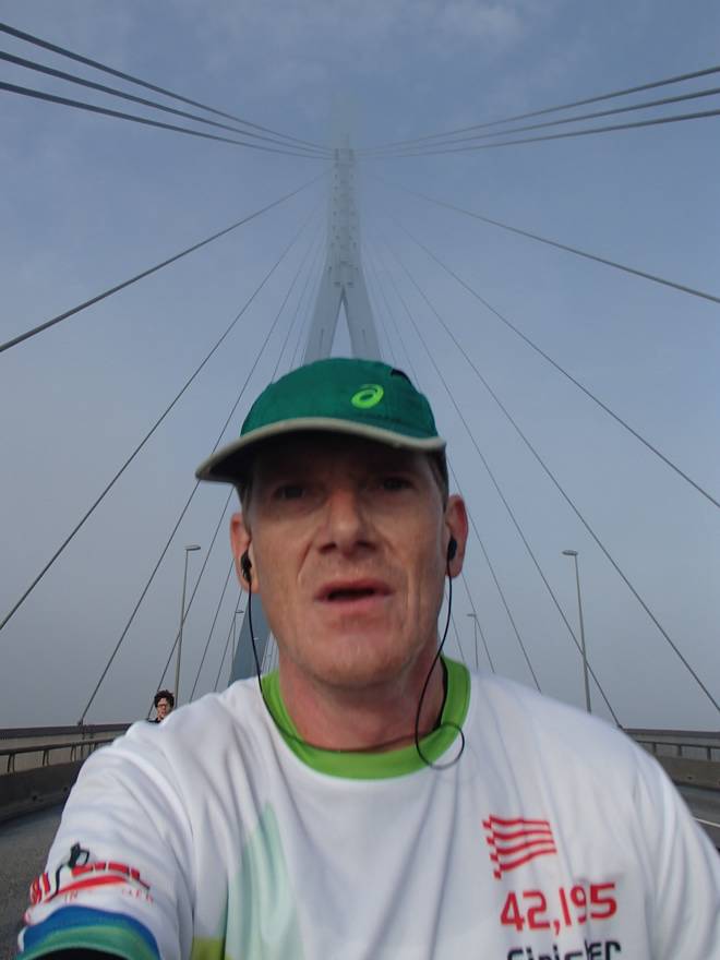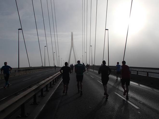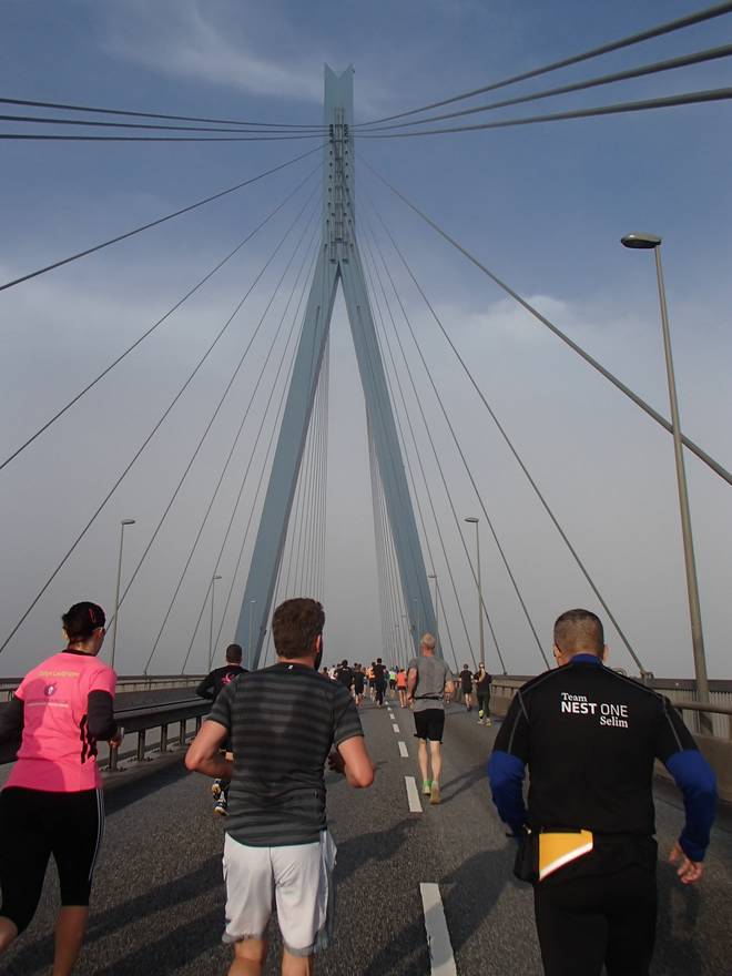 Köhlbrandbrücke 9.46 Uhr / Km 9,0 Bergab war noch nie mein Ding. Bergauf hatte ich reichlich Läufer überholt, die nun wieder an mir vorbei rannten. Später im flachen Stück ab Kilometer 10 holte ich sie dann alle wieder ein. |
