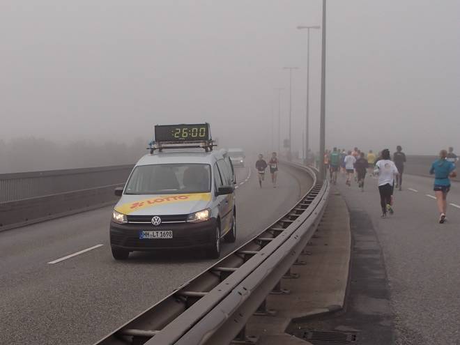 Köhlbrandbrücke 9.34 Uhr / Km 6,4 Keine schlechte Idee. Bei dem Nebel war es mit den Fotos eh nicht so toll. |