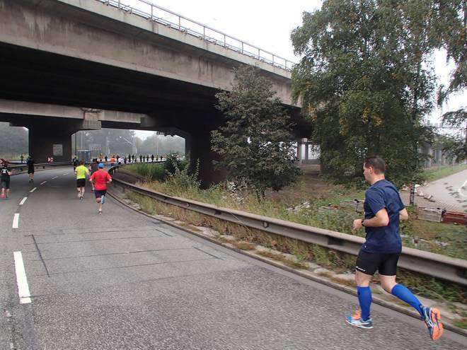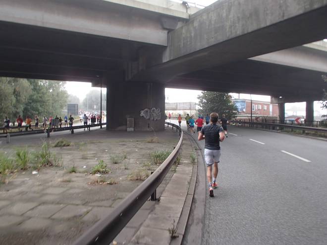 Roßdamm 9.53 Uhr / Km 10,7 Keine Ahnung wie ich das zustande brachte. Als hätte ich mich am Vortag nicht schon genug verausgabt. |
