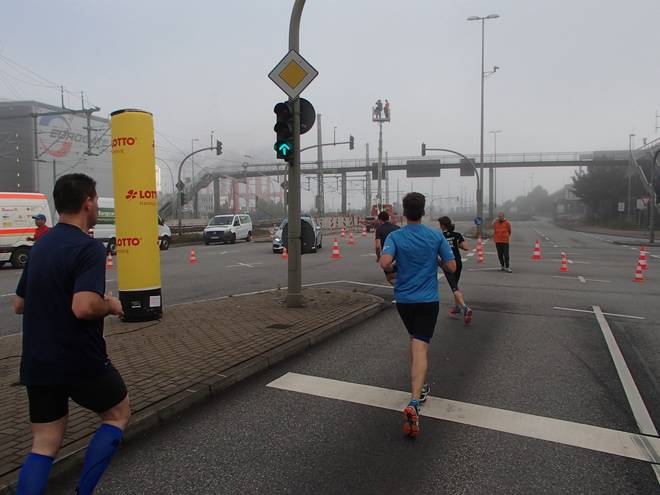 Veddeler Damm 9.05 Uhr / Km 0,6 Und was war mit dem Fuß? Ich spürte ihn zwar und er tat auch weh, aber so beim Laufen ging es. |