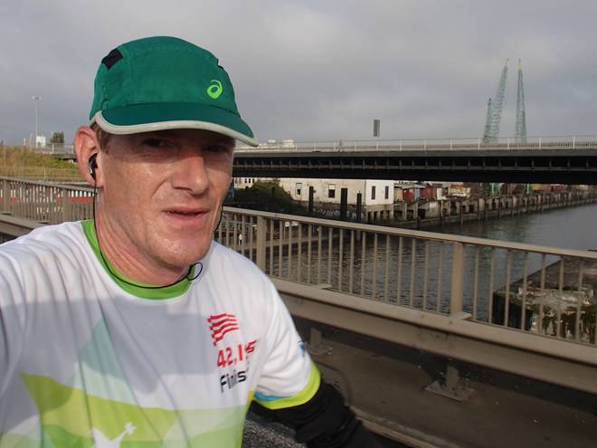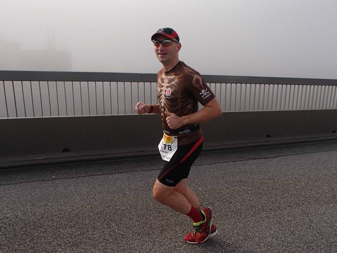 Am Windhukkai 10.12 Uhr Im Zielbereich traf ich dann noch auf Lutz, der gleich mal ein Foto von mir machte. Er selbst hatte oben auf der Brücke fotografiert, hatte wegen des Nebels aber bald kapituliert. |