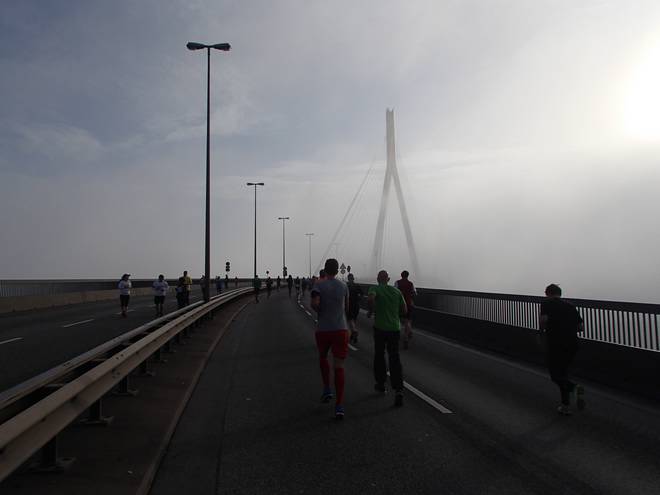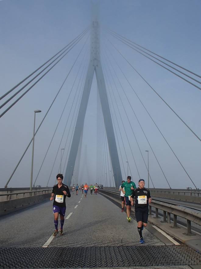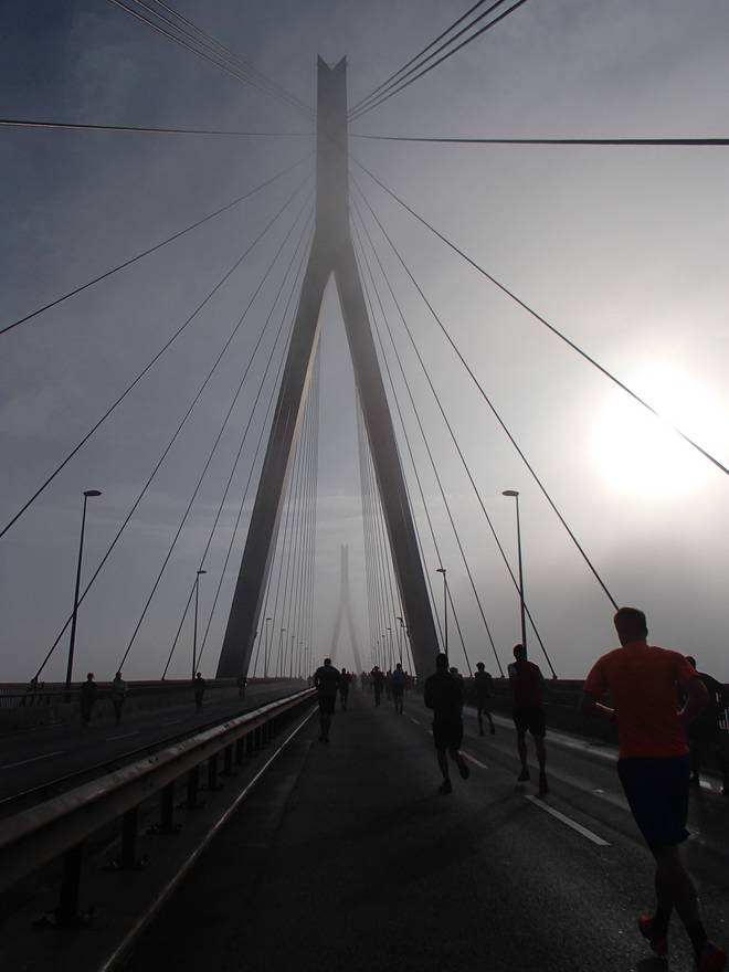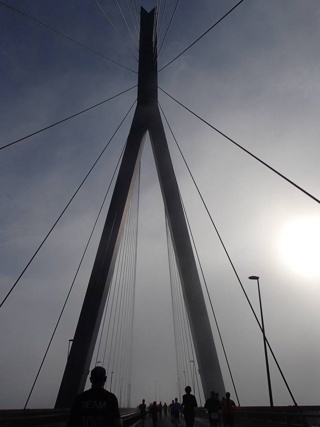 Köhlbrandbrücke 9.15 Uhr / Km 2,5 Sieht gar nicht so schlimm aus und die Spitze des Feldes war auch noch zu erkennen. Leider aber auch der Nebel, der über der Brücke hing. |