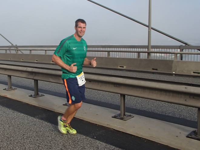 Köhlbrandbrücke 9.38 Uhr / Km 7,2 Tobias treffe ich eigentlich eher beim Marathon, aber warum nicht auch mal bei einem kürzeren Lauf? Ich war ja auch da. :-) |
