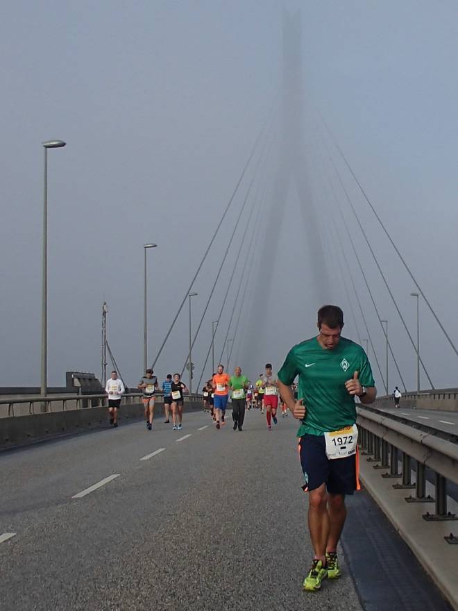 Köhlbrandbrücke 9.21 Uhr / Km 3,7 Je höher wir kamen, desto nebliger wurde es. |