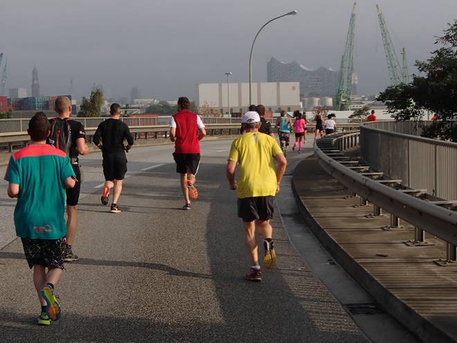 Ellernholzbrücke 9.55 Uhr / Km 11,1 Wieder die Elbphilharmonie im Blick ging es dann die Ellernholzbrücke wieder runter. |