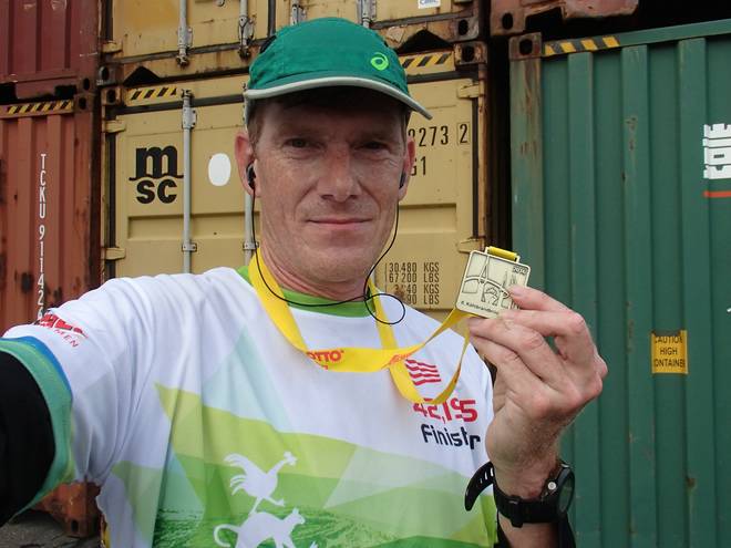 Am Windhukkai 10.02 Uhr / Km 12,0 Aber egal. Die Stunde war geknackt, der Fuß und die Hüfte hatten mich ins Ziel gebracht und ich hatte mir meine Medaille verdient. |