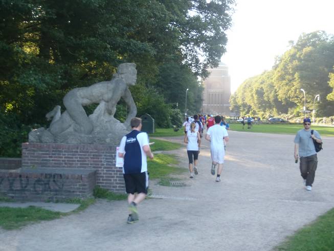 Stadtpark Hamburg, 19.21 Uhr In Orange mit Brille kam Christian, unser vierter Läufer angerannt. Nun war auch ich bald dran. |