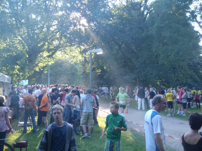 Stadtpark Hamburg, 18.52 Uhr Zum Aufwärmen lief ich vorab schon einmal fünf Kilometer, traf dabei mehrfach auf den Kurs (ohne die Läufer zu stören). |