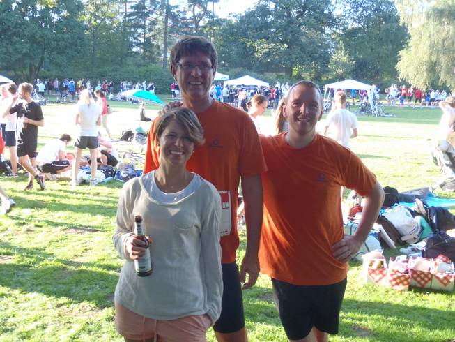 Stadtpark Hamburg, 19.10 Uhr Drei Läufer meines Teams waren schon durch: Kathrin, Thomas, Holger (von links nach rechts). Ich war erst als letzter Läufer dran. |