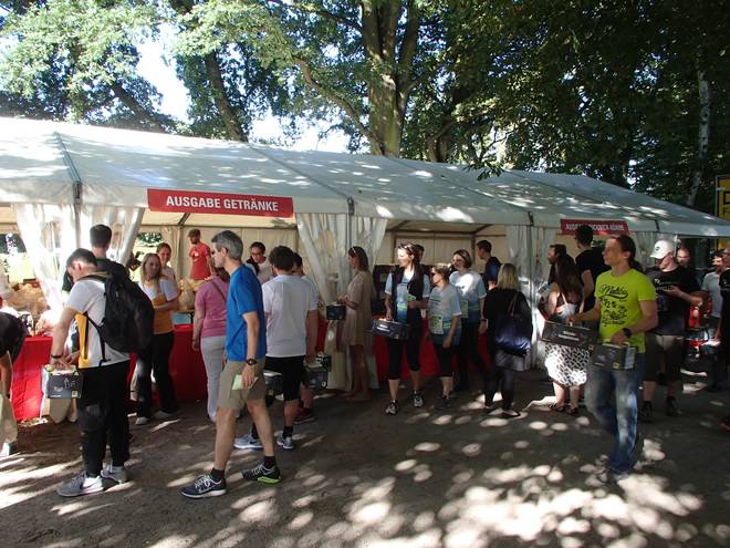 Stadtpark Hamburg 16.32 Uhr Bei der Ausgabe der Getränke und Picknick-Körbe könnte man ewig zugucken, wenn einzelne Leute versuchen, die Sachen für das ganze Team zu schleppen. |