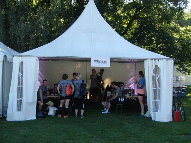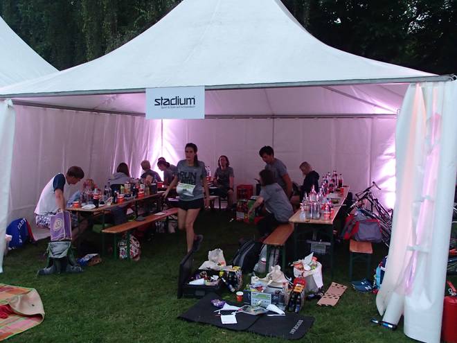 Stadtpark Hamburg 16.40 Uhr ... und mein Team sammelte sich im STADIUM-Zelt. Klar... nach sechs Teilnahmen auf der Wiese, wo wir teilweise im Regen fast ertranken, saßen wir bei heißen 25°C nun im Zelt. |