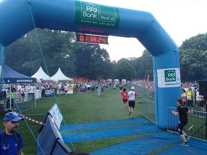 Stadtpark Hamburg 19.08 Uhr Da kam dann Christian über den Rasen Richtung Ziel. Auch er war mit seiner Zeit nicht ganz zufrieden, aber das ging uns irgendwie allen so. |