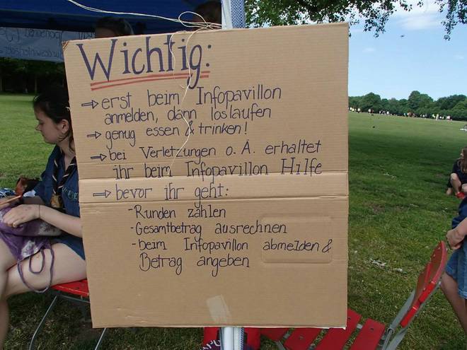 Stimmung | 4 Punkte | Die Stimmung untereinander war (wie bei Pfadfindern üblich) gut. Nach anderthalb Stunden sammelte sich eine kleine Gruppe zusammen, die den Läufern gut zusprach und Musik machte. |