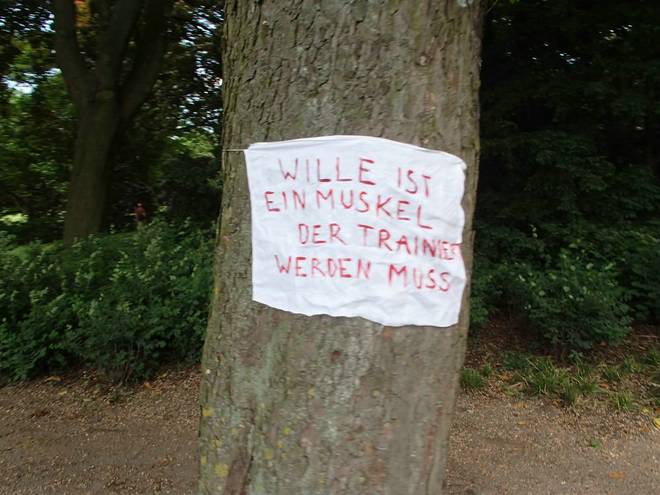 Stadtpark Hamburg 11.58 Uhr Die Ausschreibung war sehr übersichtlich. Jeder Läufer hatte sich vorher Sponsoren suchen sollen, der je Runde einen Betrag spenden würde. Man hatte vier Stunden Zeit, um so viele Runden wie möglich zu laufen. Dabei konnte man nach Belieben Pausen machen. |