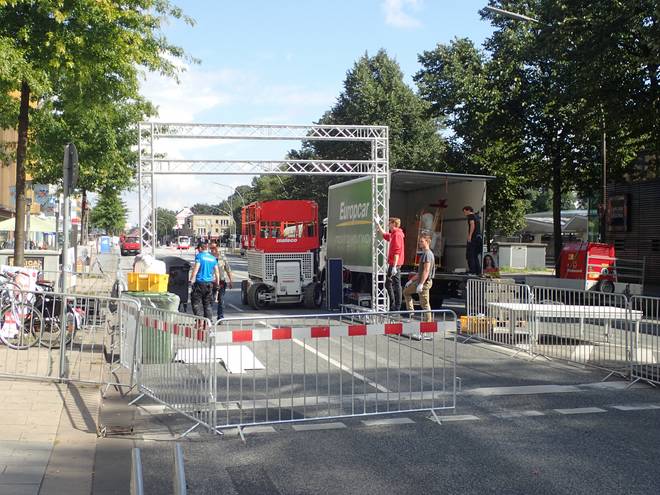 Wandsbeker Marktstraße 13.17 Uhr Vor der Tür wurde schon das Start-Ziel-Tor aufgebaut. Sie sollten sich beeilen. Um 14 Uhr kam überraschend eine Gewitterfront über Hamburg. Eine Stunde Donner und teils heftiger Regen. Am Horner Kreise sah es nach Hagel aus wie im Winter. Und der ist nur zwei Kilometer entfernt. |