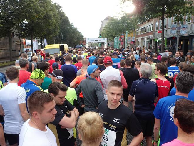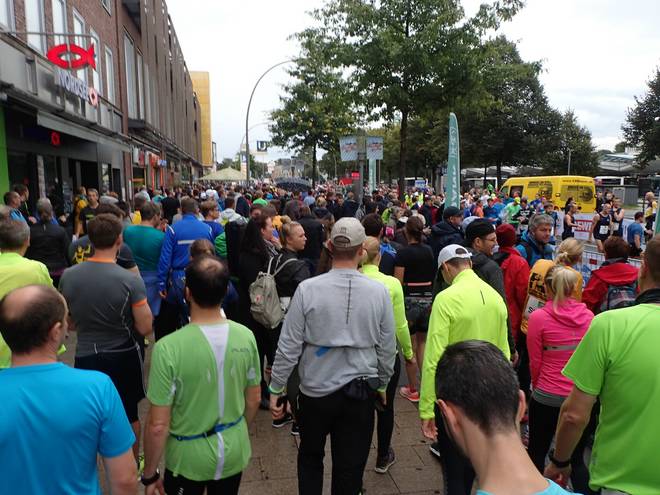 Wandsbeker Marktstraße 17.57 Uhr In der Startaufstellung wäre ein paar Zielzeit-Schilder für die Orientierung nett gewesen. So standen alle etwas ratlos da und fragten sich, ob man nicht zu weit vorne oder hinten stand. |