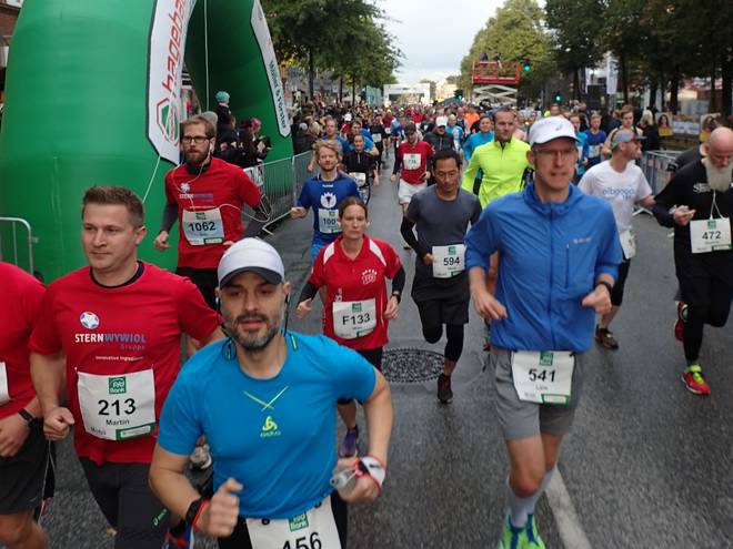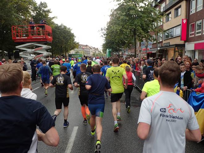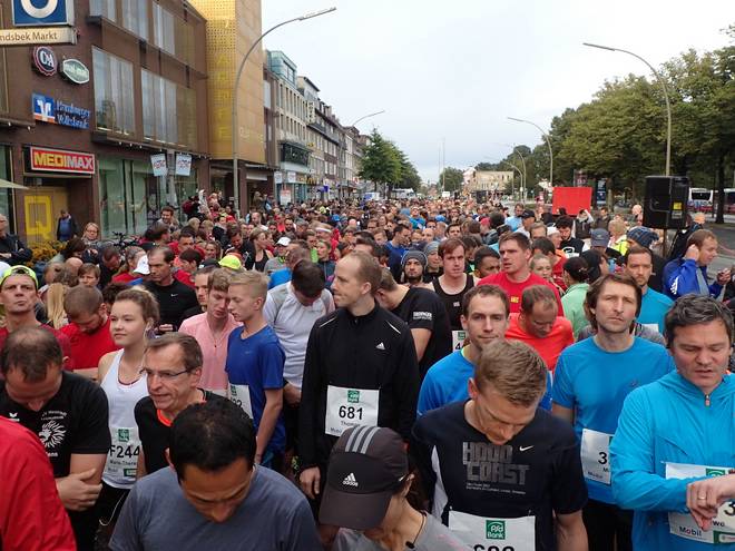 Wandsbeker Marktstraße 17.57 Uhr Der Veranstalter begrüßte über 1100 Teilnehmer. Tatsächlich waren es nur 833. Aber egal. Recht frische 12°C. Vor allem aber trocken. Die Luft war nach dem Gewitter prima. Also gute Bedingungen. |