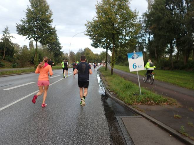 Steilshooper Allee 18.29 Uhr / Km 6,0 Der sechste Kilometer war auch wieder zu schnell, aber das Tempo fühlte sich gut an. |