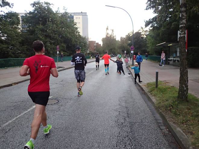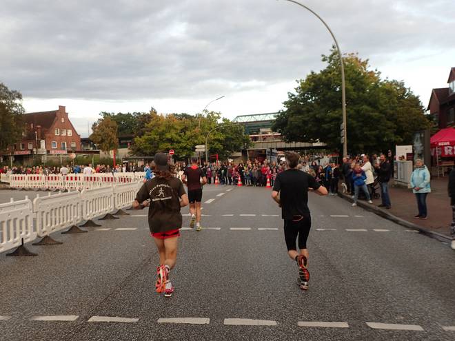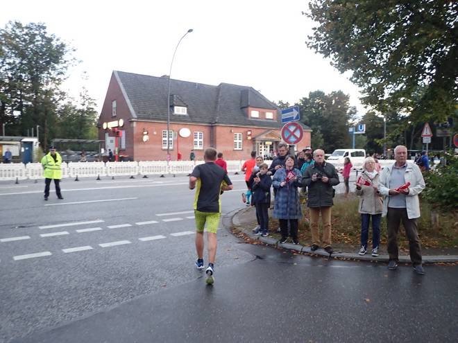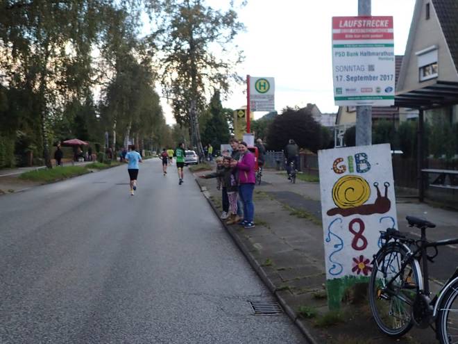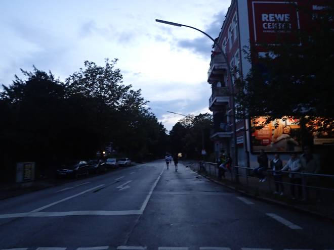 Bekassinenau 18.59 Uhr / Km 12,5 Immer wieder Zuschauer am Rand. Es gab kaum mal einen längeren Abschnitt, wo niemand stand und einen anfeuerte. Die Stimmung beim Hamburg-Marathon ist zwar noch besser, aber das ist auch kaum ein Maßstab. |