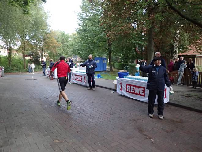 Alter Zollweg 19.10 Uhr / Km 14,9 Auch den dritten Getränkestand passierte ich, ohne zuzugreifen. Ich hatte noch keinen Durst. Die Luftfeuchtigkeit war wohl hoch genug. |
