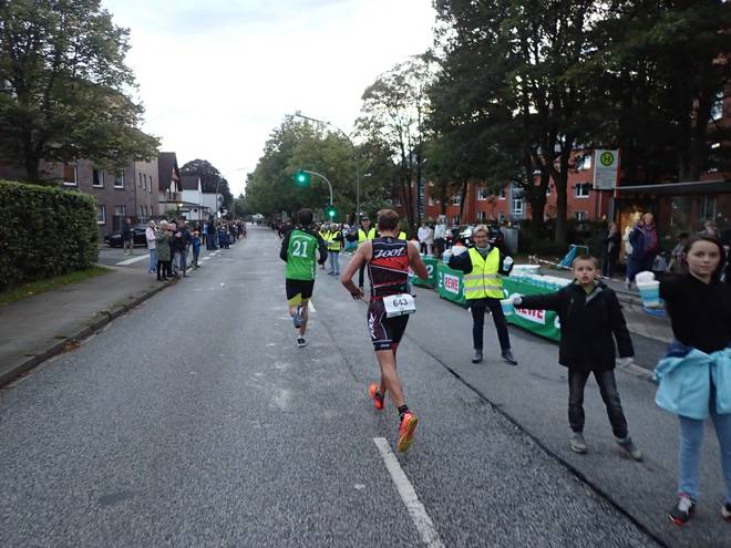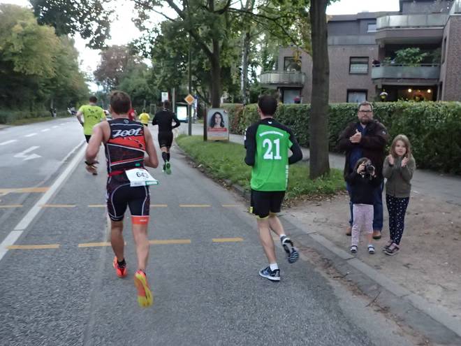 Wandsbeker Marktstraße 19.37 Uhr / Km 20,9 Auf den letzten Meter gab es noch extra Anfeuerungen von Miriam, die allerdings auf den Rollschuhen klar schneller war als ich. |